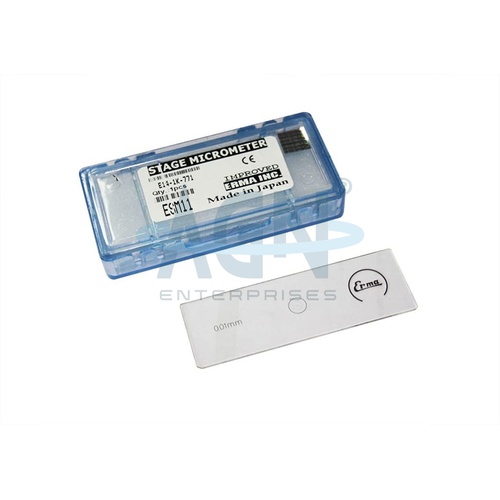 Erma Japan Stage Micrometer, model AGN-BI049/2. Precisely measures microscopic distances. Essential for calibration and precision measurement in scientific applications.