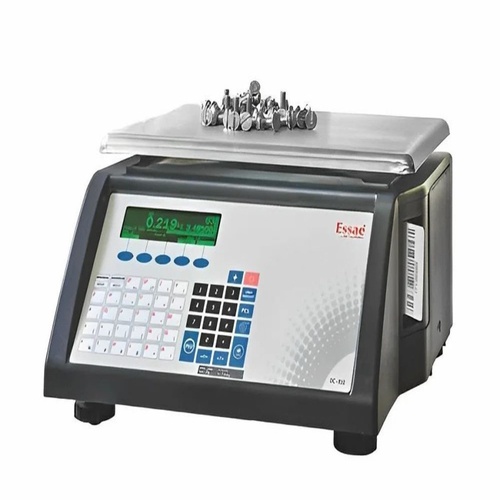 Essae DC-810 Bench Type Barcode Label Printer, Steel construction. Features 0.5 gm accuracy, LCD display, and 4-inch print width at 5 inch/sec speed.