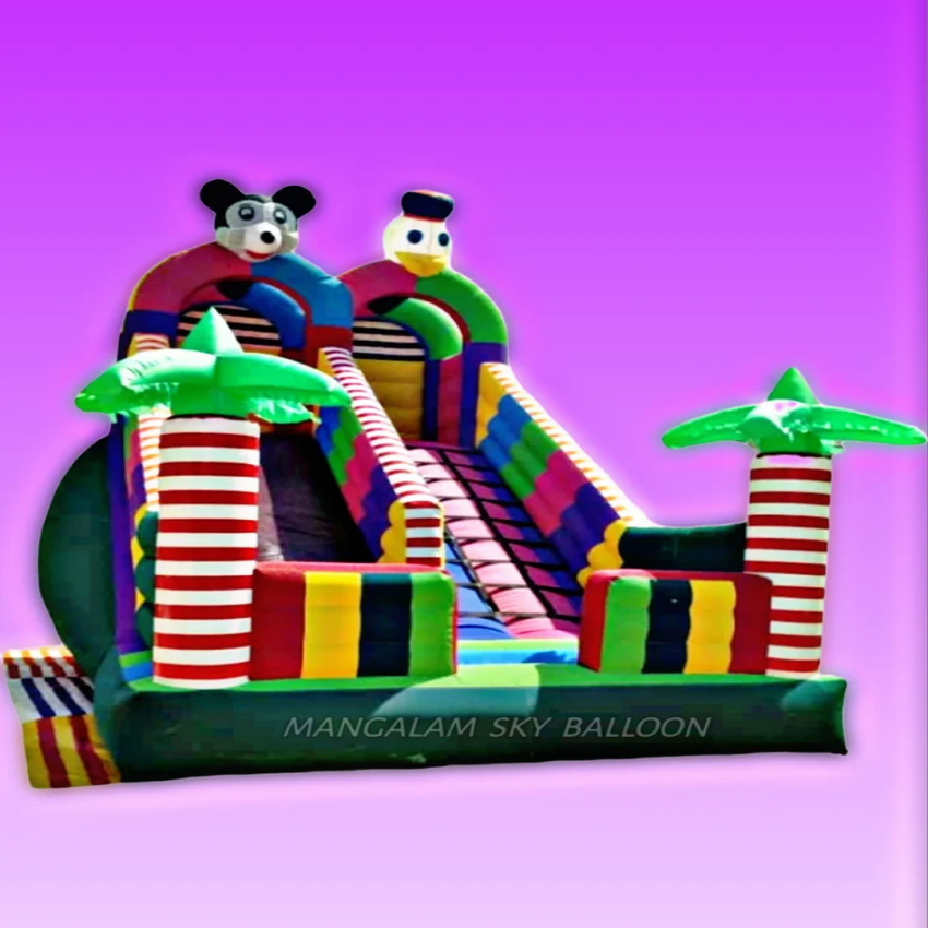 Multicolor inflatable jumping bouncy for events, made with 2mm thickness and weighing 75kg. Customizable shape and design options available.