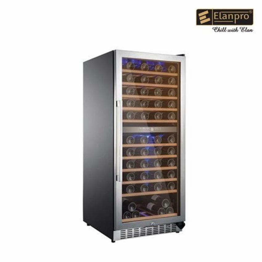 Elanpro EWG 130 D bottle cooler features 128-bottle capacity, 5-22°C temperature range, 11 shelves, and 110W power consumption. Dimensions are 595 x 680 x 1417 mm.