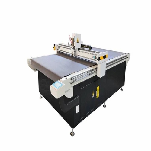Automatic CNC oscillating knife cutting machine for fabric, denim, cloth, and gaskets. Features 600 x 600 mm XY axis and 10 mm cutting knife.