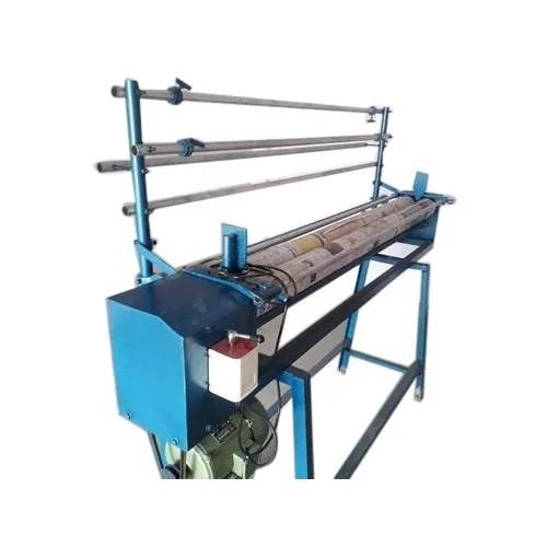 Semi-automatic MS fabric rolling and rewinding machine. Operates on 220V, 50Hz, 1 HP, with a capacity of 2000 MTR/hr for converting large rolls to smaller ones.
