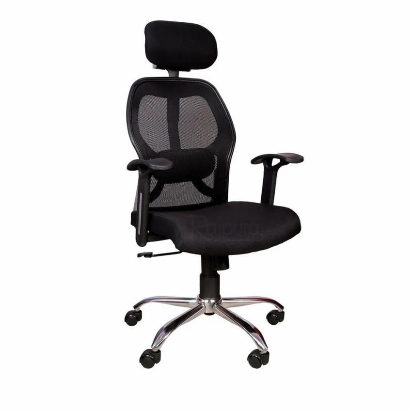 Black fabric office chair with high back, height adjustability, and a 1-year warranty. Made in India.