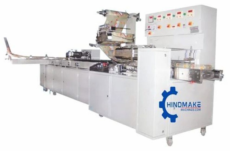 Automatic food industry biscuit packing machine with center seal type. Features Delta PLC, Rotomotive gearbox, PID controller, 7-inch HMI touch screen. Operates on 4400V, three-phase.