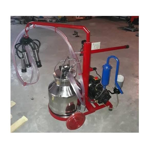 Semi-automatic milking machine with 1 HP single-phase motor. Features 50 Hz frequency, 220 V AC voltage, and 300 lpm vacuum speed. Handles 10-15 cows per hour with a single bucket.