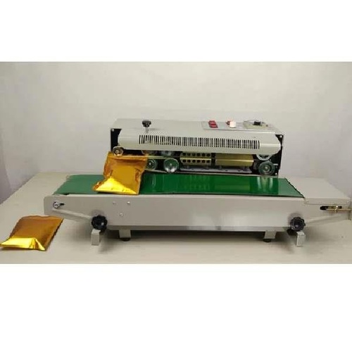 Semi-automatic horizontal pouch sealing machine (FR900) for pouches. Features a 3kg max conveyor load, 1 pouch/4sec capacity, and MS construction for high-speed packaging.