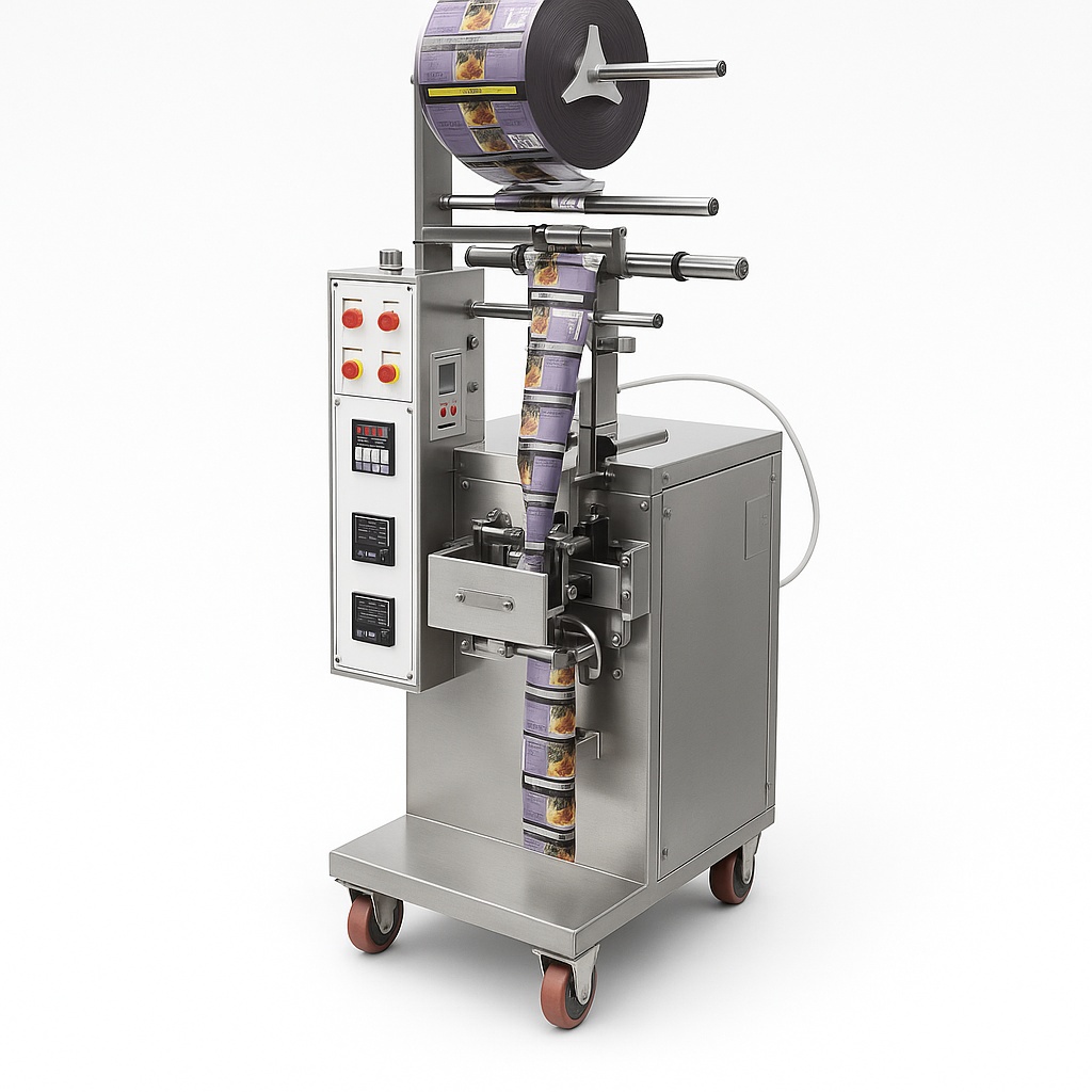 SS304 FFS pouch packing machine with volumetric piston filling for liquid/semi-liquid. Fills up to 250ml, 35-55 pouches/min. Features 2HP single-phase motor.