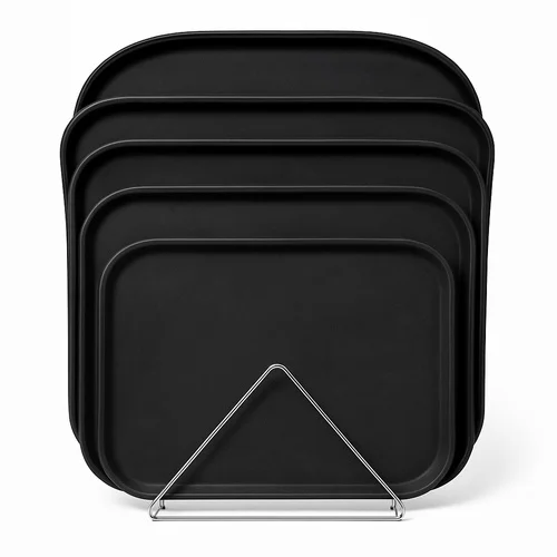 Small black fiber anti-skid tray, plain pattern, 10 inches long. Suitable for restaurant applications. Manufactured in India.