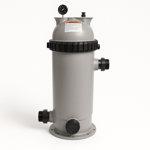 Semi-automatic fiber glass cylindrical cartridge filter for swimming pools. Operates at 75 PSI, 50 Hz, 220V. Polypropylene filter medium.