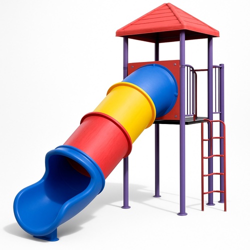 New, non-customized, covered fiberglass (FRP) tube slide. Ideal for schools, parks, and resorts. Provides a safe and enclosed sliding experience.