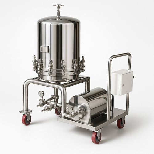 Automatic filter press machine with 500 L/Hr filtration capacity. Features stainless steel frame and body, 500 filter area, and 10 plates.