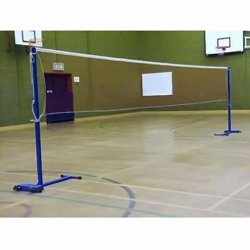 Blue fixed badminton post constructed from SS material. Designed for sports applications with a 4 ft pole height and 5 ft length. Durable and stable.