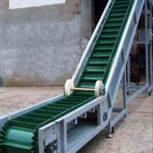Mild steel flexible inclined conveyor for pharma use. 50-100 kg/feet capacity, 15 feet length, 600 mm belt width. 220V, single phase, 50Hz, 2-3 m/s speed.