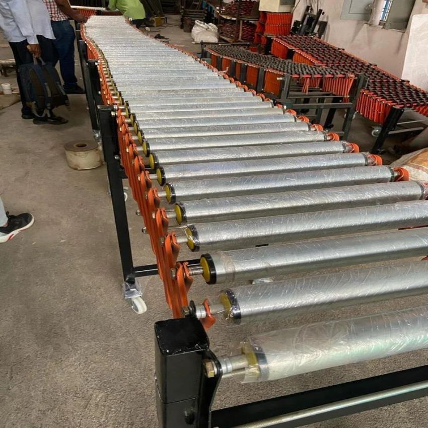 50 feet flexible powered roller conveyor. 50 mm roller diameter, 50 kg capacity. Suitable for warehouse operations. Weighs 300 kg. Made in India.