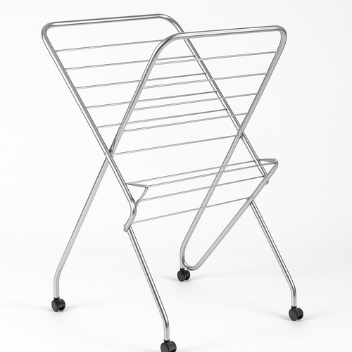 Foldable stainless steel cloth drying stand with wheels. Supports up to 45 KGS. Polished finish, 167 CM height. Portable for easy storage and movement.