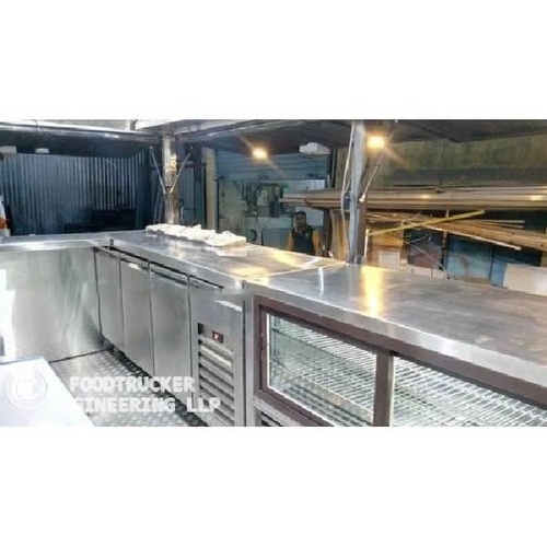 Stainless steel food truck interior with mirror finish. Equipped with 4 exhaust fans and a fire suppression system including extinguisher and signage.
