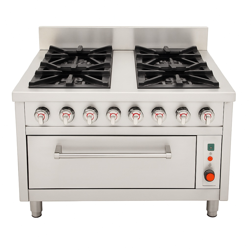 36X36X34+4 SS 304 four burner gas and electric range with oven. Powered by 220v. New condition, four stove burners.