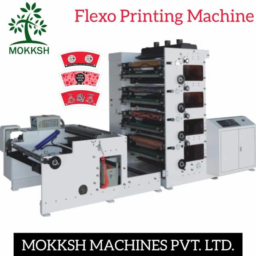 Automatic four color flexo printing machine for paper. Operates at 30 m/min printing speed with a max printing length of 0-500 mm. Features polished surface finish.