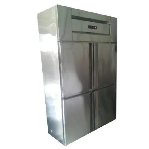 Commercial refrigerator with four doors and a stainless steel body. Features a top freezer and operates on electricity. Stands 5 feet tall.