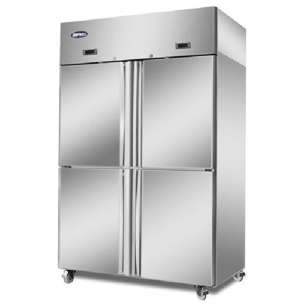 Stainless steel four-door refrigerator with 220-240V voltage. This appliance offers ample storage and reliable cooling performance for commercial or domestic use.