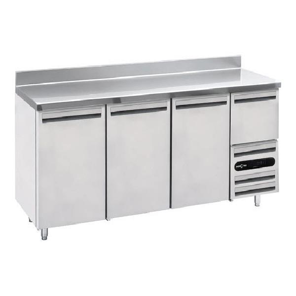 This stainless steel under-counter refrigerator features four doors. Providing ample storage and durable construction, it is designed for efficient and reliable cooling in demanding environments.