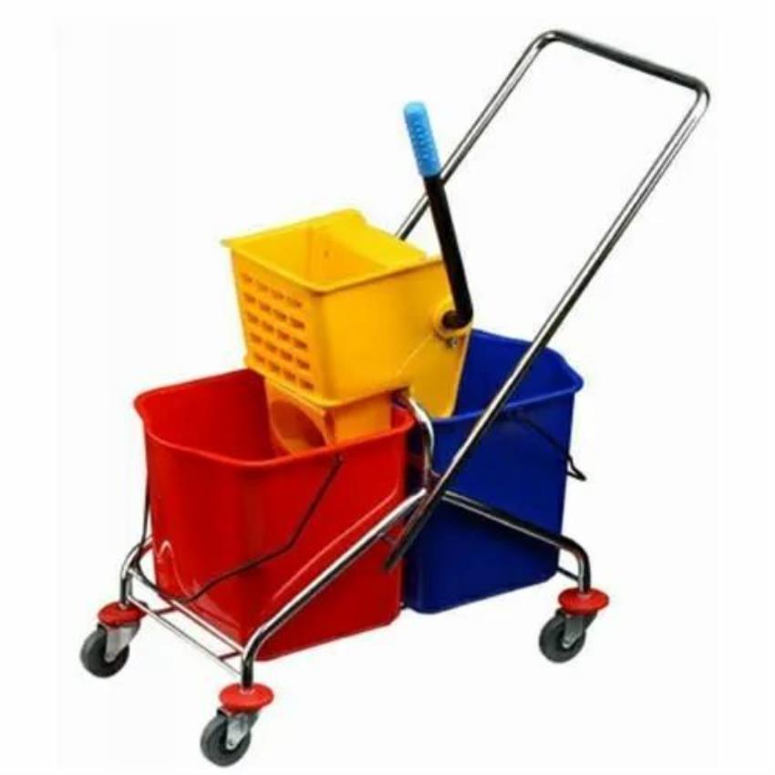 Two-bucket wringer trolley with four wheels for easy maneuverability. Constructed from plastic, it has a 60-liter loading capacity, suitable for hotels and hospitals.