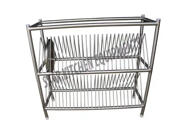 Rectangular, free-standing plate rack made of polished stainless steel. Designed for restaurant usage. Offers durable and hygienic storage solution for professional kitchens.
