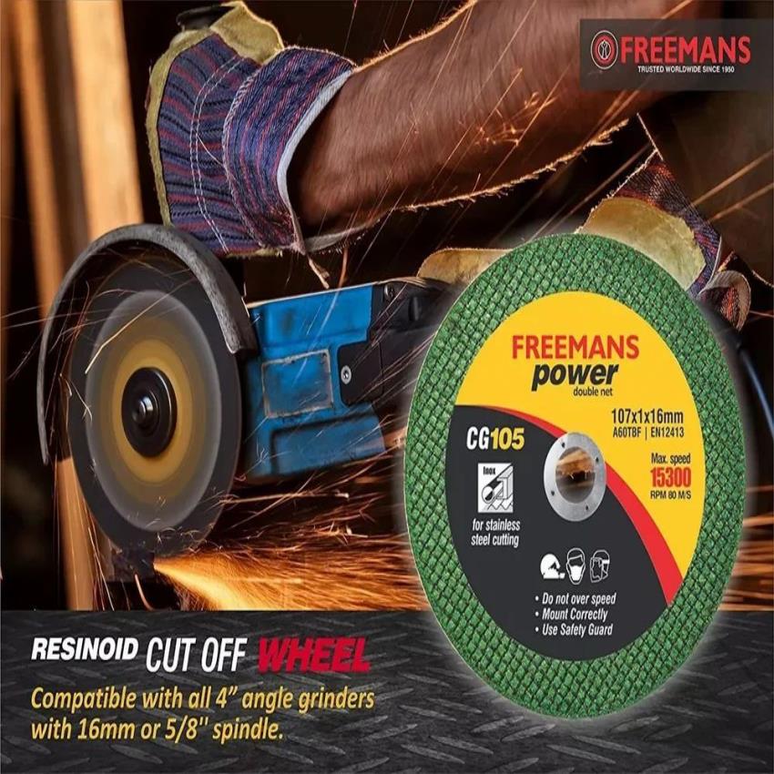 Freemans CG105 cutting disc, 4-inch diameter. Features a round shape and red & green color combination for visibility. Ideal for cutting applications. Durable construction for extended use.