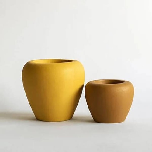 Yellow, cylindrical FRP pots made from plastic for garden use. Floor-mounted design provides stable placement. Ideal for a variety of plants and outdoor decor.