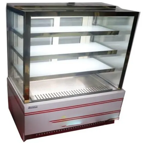 Floor-standing rectangular commercial food counter made from SS and glass. Designed for displaying food items in professional settings.