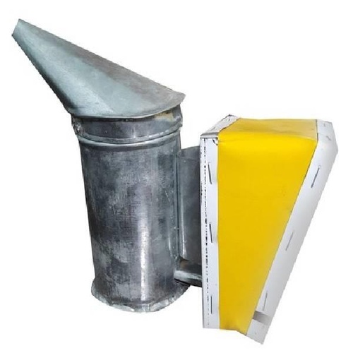Galvanized iron and rubber cone-shaped bee smoker. Features an air inflator, 9cm diameter, and 16cm height. Used to safely smoke bees and prevent stings.