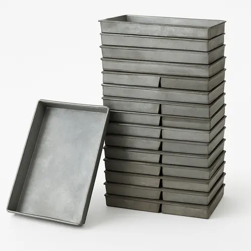 Rectangular galvanized iron baking tray. 0.4mm thickness, size 13*18. Weighs 2kg, made in India. Suitable for bakery applications.