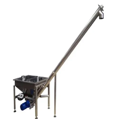 Automatic mild steel inclined screw conveyor with a galvanized surface. Designed for industrial applications.
