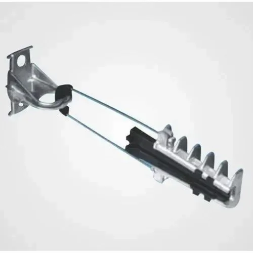 Galvanized steel clamp for aerial cabling. Ensures secure termination of conductors in overhead electrical systems. Durable and corrosion-resistant for long-term performance.