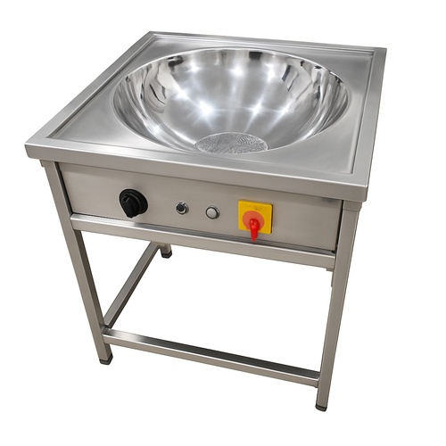 Stainless steel electric kadai with gas range equipment type. Designed for restaurant applications. Material: Stainless Steel. Color: Stainless Steel. Made in India.