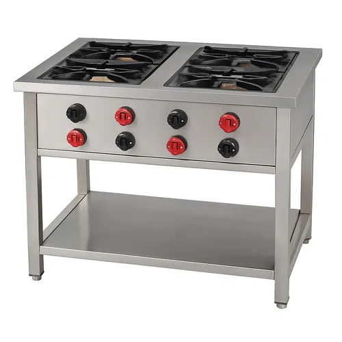 This gas range features four burners for versatile cooking. Designed for efficient operation in commercial or home kitchens. Durable construction ensures long-lasting performance.