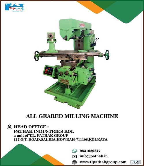 Semi-automatic geared milling machine for industrial use. Features ISO 40 spindle taper, 18 feeds, 3 HP main motor, and 12 spindle speeds from 40-1200 RPM. Made in India.