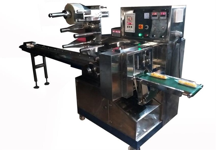 This machine wraps bathing soap in pillow pouches at 45-60 units/minute. Features PID temp control, 1 HP gear motor, 3 Kw power, 220V electric supply. Weighs approx. 500 Kg.