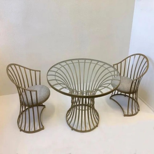 Modern 2-seater round dining table with transparent glass top. Features brown foam seats, mild steel frame, and includes 2 chairs. Assembled and ready for home use.