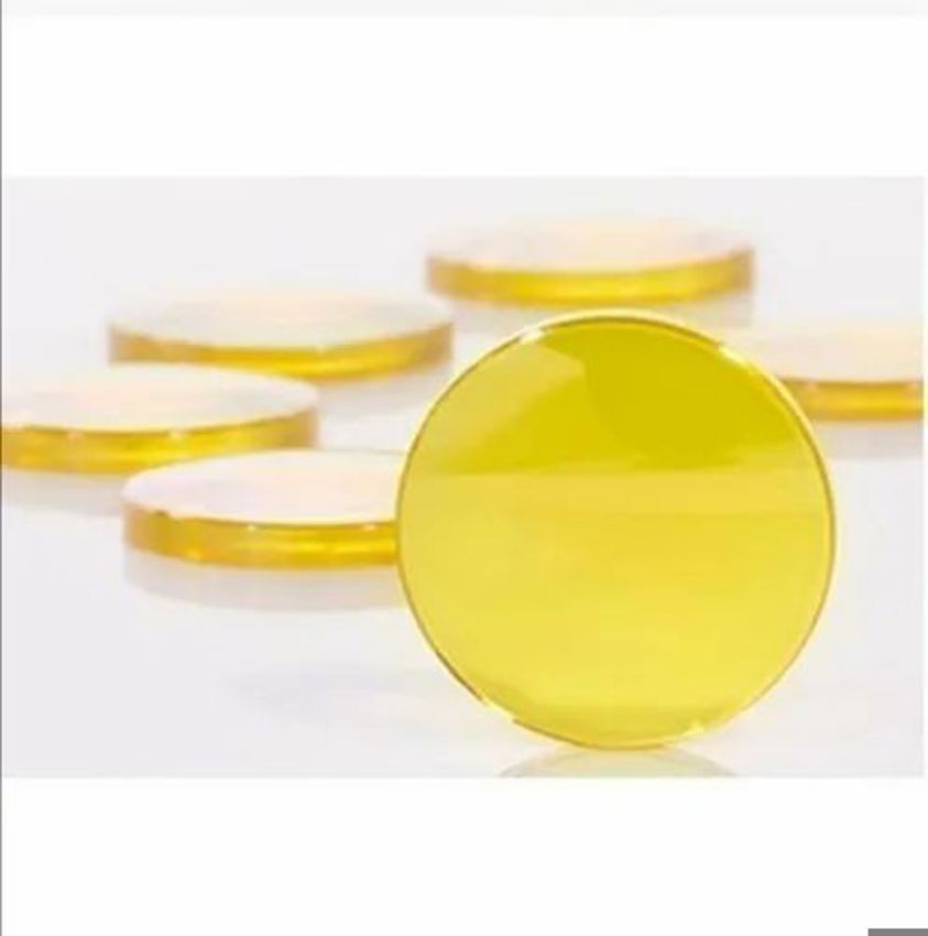 Yellow glass CO2 laser focus lens for laser machines. Made in India with high-quality material for precise focusing. Suitable for LED light sources.