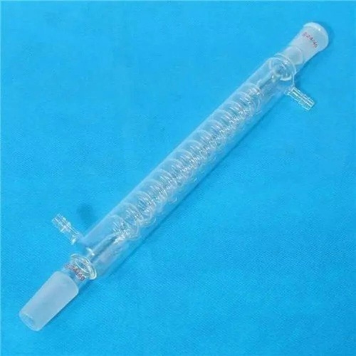 Transparent glass condenser, 200 mm length, cylindrical shape. Ideal for chemical laboratory applications. Packaged for safe transport and immediate use.