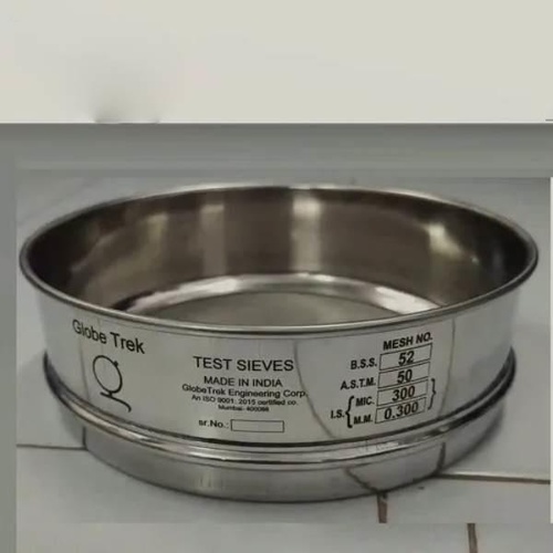 Globetrek SS testing sieves, 8-inch diameter, made of Stainless Steel 304. Features mesh sizes from 10mm down to 25 Micron for lab particle size analysis.