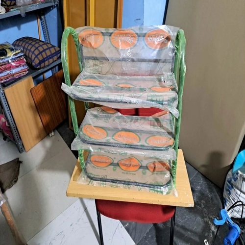 Green glossy 4-shelf shoe rack made of mild steel. Free-standing, portable design for convenient shoe organization. Ideal for home and commercial use.