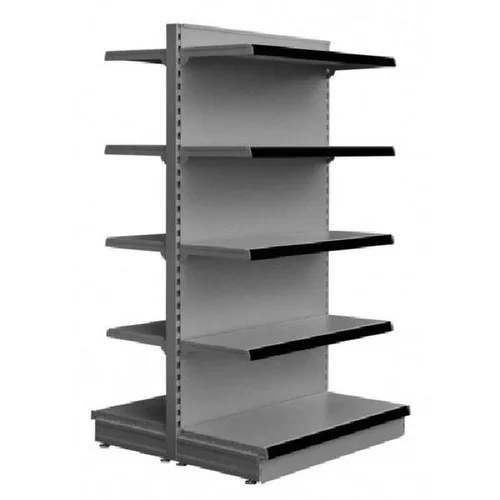 Black mild steel free-standing gondola shelving unit for showrooms. Supports up to 300 kg weight tolerance capacity. Durable construction for retail display needs.
