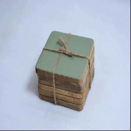 Set of 6 round wooden coasters, antique finish, green color. Designed for home use. Minimum order quantity is 24 pieces. (Shape: Round, Application: Home, Color: Green).