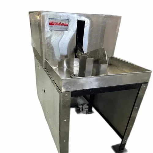 Semi-automatic green coconut cutting machine. Made of stainless steel with an MS frame. Three-phase, 440V power, 150KG weight, continuous production capacity. Ideal for industrial use.