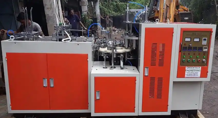 New, automatic paper processing machine. Features one-year motor warranty and low power consumption (2.5-3 Units/Hr). Designed for efficient paper cup production.