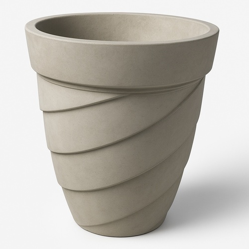This grey cement garden planter has a height of 16 inches and a bottom width of 16 inches. Top width measures 22 inches. Minimum order: 500 pieces.