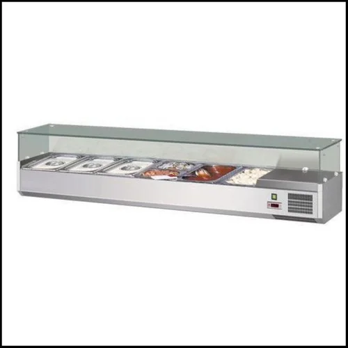 Grey stainless steel chilled display counter for commercial use. Features a stainless steel top workbench. Ideal for restaurants and food service applications. New style.