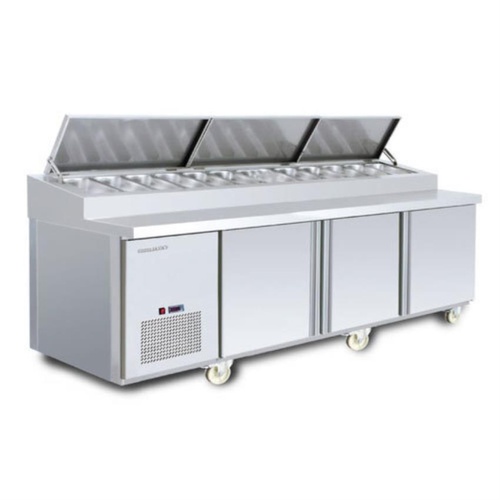 Grey stainless steel pizza counter chiller with a top workbench. Features 5 shelves and single-phase power. Durable construction for commercial kitchens.